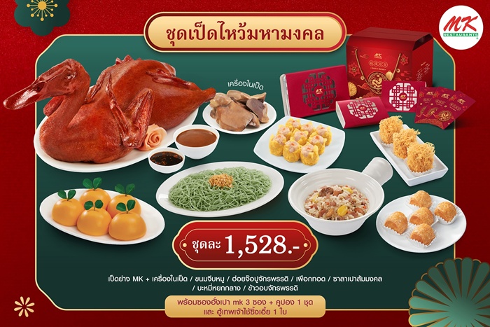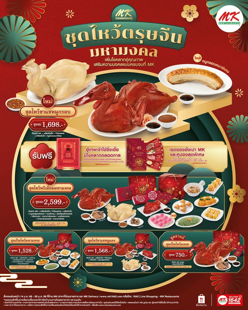 MK Restaurant แจกความมงคลฟรีเพิ่มให้อีก เมื่อสั่งชุดใดก็ได้ รับ ‘เซตซองอั่งเปา’ พร้อมคูปองสุดพิเศษ จำนวน 1 ชุด และรับ ‘ฮู้เทพเจ้าไฉ่ซิงเอี๊ย’ ให้มีโชคลาภตลอดกาล เฉพาะลูกค้าที่สั่งซื้อชุดเป็ดไหว้มหามงคล ชุดไหว้ซาแซหมูกรอบ ชุดไหว้ซาแซหมูแดง และชุดไหว้พรีเมียมมหามงคลเท่านั้น (สินค้ามีจำนวนจำกัด) เฉพาะวันที่ 14 – 28 มกราคม 2568 (หรือจนกว่าสินค้าจะหมด)