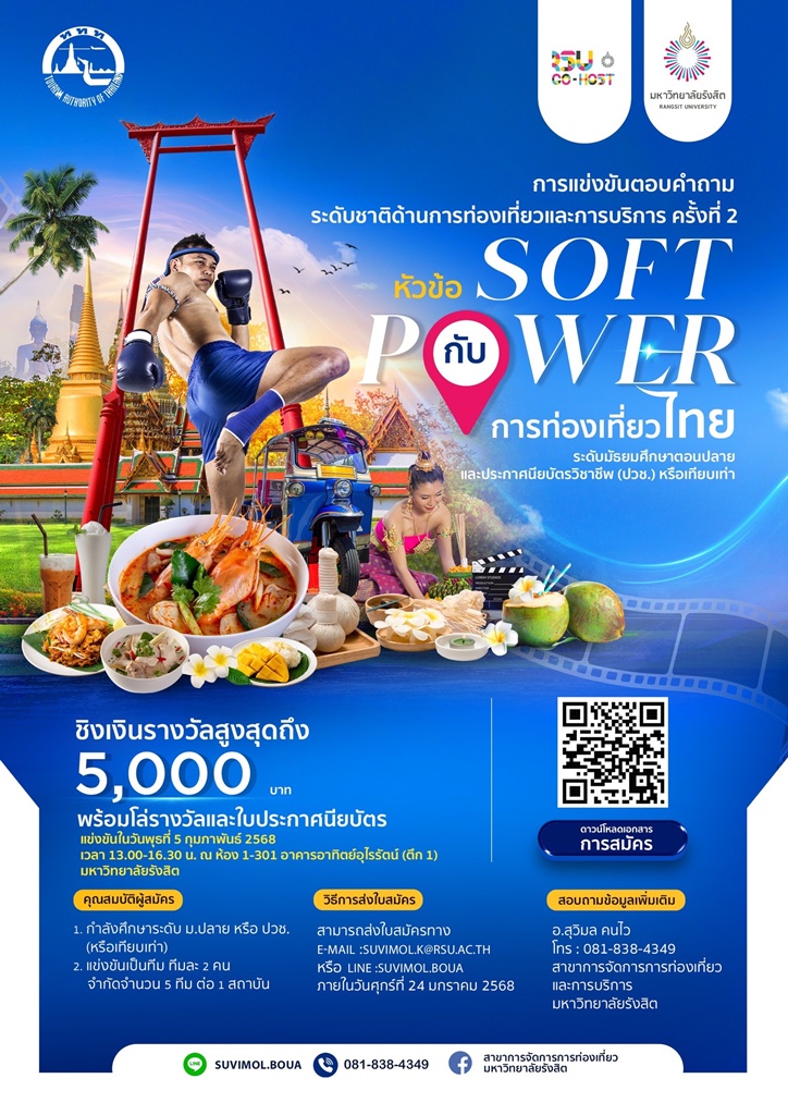 สาขาการจัดการการท่องเที่ยวและการบริการ วิทยาลัยการท่องเที่ยวและอุตสาหกรรมการบริการ มหาวิทยาลัยรังสิต ร่วมกับการท่องเที่ยวแห่งประเทศไทย(ททท.) เชิญชวนนักเรียนระดับชั้น ม.4-6 ปวช. หรือเทียบเท่า เข้าร่วมการแข่งขันตอบคำถามระดับชาติด้านการท่องเที่ยวและการบริการ ครั้งที่ 2 ในหัวข้อ “Soft Power กับการท่องเที่ยวไทย” ชิงเงินรางวัลสูงสุดถึง 5,000 บาท พร้อมโล่รางวัลและใบประกาศนียบัตร ในวันพุธที่ 5 กุมภาพันธ์ 2568 เวลา 13.00–16.30 น. ณ ห้องประชุม 1–301 อาคารอาทิตย์ อุไรรัตน์ (อาคาร 1) มหาวิทยาลัยรังสิต