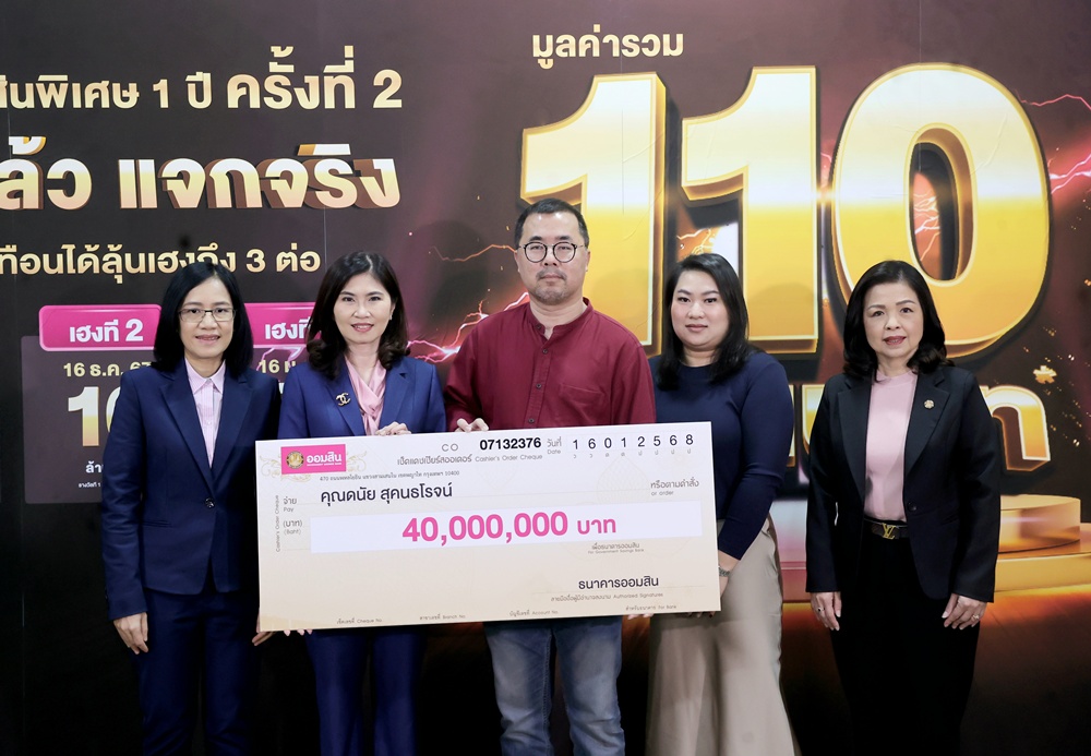 นางสาวศิริพร เลิศสัตยสุกใส รองผู้อำนวยการธนาคารออมสิน กลุ่มลูกค้าบุคคล มอบรางวัลพิเศษ 40 ล้านบาท ให้แก่ นายดนัย สุคนธโรจน์ ลูกค้าธนาคารออมสิน สาขาเดอะมอลล์ บางแค กรุงเทพฯ โดยเป็นผู้โชคดีถูกรางวัลพิเศษจากสลากออมสิน 1 ปี งวดที่ 607 หมวดอักษร J หมายเลขสลาก 0566264 จากแคมเปญแจกสะเทือนได้ลุ้นเฮงถึง 3 ต่อ ซึ่งเป็นการออกรางวัลพิเศษครั้งที่ 2 ครั้งสุดท้าย โดยมีผู้บริหารร่วมเป็นสักขีพยาน ณ ธนาคารออมสินสำนักงานใหญ่ เมื่อวันที่ 21 มกราคม 2568