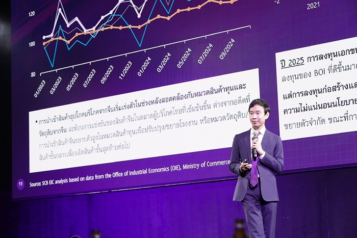 เศรษฐกิจไทยในปี 2025 มีแนวโน้มขยายตัวชะลอลงอยู่ที่ 2.4% จากผลกระทบการกีดกันการค้ารุนแรงขึ้นจากนโยบาย Trump 2.0 เนื่องจากสินค้าส่งออกไทยไปสหรัฐฯ ส่วนใหญ่เป็นกลุ่มสินค้าที่สหรัฐฯ ตั้งเป้าลดการขาดดุลการค้าและต้องการสนับสนุนห่วงโซ่อุปทานในประเทศทดแทน นอกจากนี้ สงครามการค้ารอบใหม่จะทำให้ไทยมีแนวโน้มนำเข้าสินค้าจีนมากขึ้น ความสามารถในการแข่งขันของสินค้าไทยทั้งตลาดในและนอกประเทศจะมีปัจจัยกดดันมากขึ้น ส่งผลให้การส่งออกไทยเติบโตชะลอลง โดยเฉพาะช่วงครึ่งปีหลังที่นโยบายกำแพงภาษีของสหรัฐฯ จะเริ่มกระทบหลายประเทศ การลงทุนภาคเอกชนจะกลับมาฟื้นตัวได้ในปีหน้า แต่ฟื้นไม่แรงมากนักจากความเปราะบางของภาคอุตสาหกรรม ซึ่งได้รับผลกระทบจากสินค้าจีนเข้ามาตีตลาดและอุปสงค์ในประเทศซบเซา ในช่วงปีนี้ เศรษฐกิจไทยโดยรวมมีความเสี่ยงหลายด้าน ขณะที่รายได้ครัวเรือนยังฟื้นตัวจำกัด ปัญหาหนี้ครัวเรือนจึงน่าจะใช้เวลาคลี่คลายส่งผลกดดันการบริโภคภาคเอกชน ขณะที่ยังต้องติดตามคุณภาพสินเชื่อรายย่อยทั้งระบบที่ยังเปราะบาง ท่ามกลางความระมัดระวังในการปล่อยสินเชื่อของสถาบันการเงิน