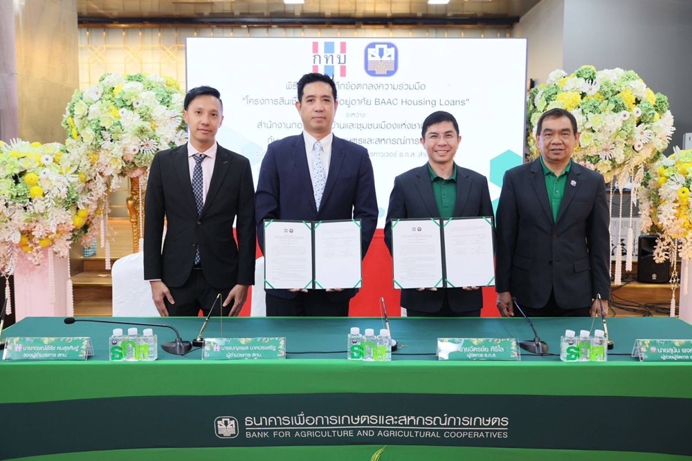 นายฉัตรชัย ศิริไล ผู้จัดการธนาคารเพื่อการเกษตรและสหกรณ์การเกษตร (ธ.ก.ส.) พร้อมด้วยนายเบญจพล นาคประเสริฐ ผู้อำนวยการสำนักงานกองทุนหมู่บ้านและชุมชนเมืองแห่งชาติ (สทบ.) ร่วมลงนามบันทึกข้อตกลงความร่วมมือโครงการสินเชื่อเคหะเพื่อที่อยู่อาศัยระหว่าง ธ.ก.ส. และสำนักงานกองทุนหมู่บ้านและชุมชนเมืองแห่งชาติ ซึ่งถือเป็นหน่วยงาน ที่มีบทบาทในการส่งเสริมชุมชนให้เกิดความเข้มแข็งด้านเศรษฐกิจและการพัฒนาคุณภาพชีวิต ทั้งนี้ เพื่อให้บุคลากรของ สทบ. ได้เข้าถึงบริการสินเชื่อเพื่อซื้อที่ดินพร้อมสิ่งปลูกสร้าง การปลูกสร้างที่อยู่อาศัย ปรับปรุงหรือซ่อมแซมที่อยู่อาศัย อาทิ บ้าน คอนโดมิเนียม และทาวน์โฮม เป็นต้น รวมไปถึงการไถ่ถอนจำนองที่ดินพร้อมสิ่งปลูกสร้าง (Refinance) จากสถาบันการเงินอื่น กรณีมีประกันคุ้มครองวงเงินสินเชื่อ 5 ปีแรก อัตราดอกเบี้ยร้อยละ 2.99 ต่อปี ปีที่ 6 – 8 อัตราดอกเบี้ย MRR ลบร้อยละ 2 ต่อปี (ปัจจุบัน MRR อยู่ที่ร้อยละ 6.875 ต่อปี) และปีที่ 9 เป็นต้นไป อัตราดอกเบี้ย MRR ลบร้อยละ 0.25 ต่อปี กรณีไม่มีประกันคุ้มครองวงเงินสินเชื่อ 5 ปีแรก อัตราดอกเบี้ยร้อยละ 3.60 ต่อปี ปีที่ 6 – 8 อัตราดอกเบี้ย MRR ลบร้อยละ 2 ต่อปี และปีที่ 9 เป็นต้นไป อัตราดอกเบี้ย MRR ลบร้อยละ 0.25 ต่อปี วงเงินให้กู้สูงสุดไม่เกิน 5 ล้านบาทต่อหลักประกัน ผ่อนชำระเพียงล้านละ 2,900 บาทต่อเดือน เมื่อวันที่ 23 มกราคม 2568 ณ โถงชั้น 2 อาคารทาวเวอร์ ธ.ก.ส. สำนักงานใหญ่