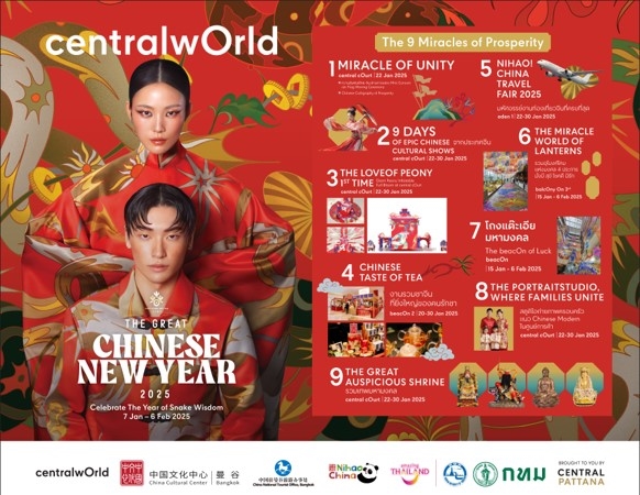 กรุงเทพฯ – ศูนย์การค้าเซ็นทรัลเวิลด์ ไลฟ์สไตล์แลนด์มาร์กเดสติเนชั่นระดับโลกใจกลางเมือง ผนึกกำลัง การท่องเที่ยวแห่งประเทศไทย, กรุงเทพมหานคร, สถานเอกอัครราชทูตจีนประจําประเทศไทย, และการท่องเที่ยวจีน (CNTO) ฉลองเทศกาลตรุษจีนปียิ่งใหญ่ระดับโลกรับปีมะเส็งมหามงคล เปิดแคมเปญ “centralwOrld The Great Chinese New Year 2025” ชู ‘The 9 Miracles of Prosperity’ 9 ปาฏิหารย์แห่งความเจริญร่งเรือง มั่งมี สุขี โชคดี มีรัก ตลอดทั้งปี ตอกย้ำแลนด์มาร์กแห่งการฉลองตรุษจีนที่ดีที่สุดใจกลางเมือง ชวนจับจ่าย-ไหว้-กิน-เที่ยว ครบจบในที่เดียว พร้อมต้อนรับคนไทยและนักท่องเที่ยวทั่วโลก ปักหมุดงานตรุษจีนยิ่งใหญ่หนึ่งเดียวใจกลางเมืองที่ทุกคนต้องมาเยือน