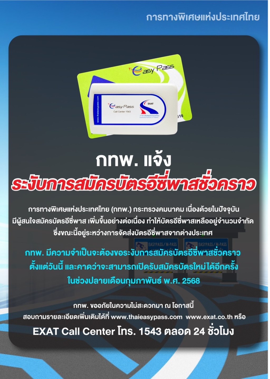 การทางพิเศษแห่งประเทศไทย (กทพ.) กระทรวงคมนาคม เนื่องด้วยในปัจจุบันมีผู้สนใจสมัครบัตรอีซี่พาส เพิ่มขึ้นอย่างต่อเนื่อง ทำให้บัตรอีซี่พาสเหลืออยู่จำนวนจำกัด ซึ่งขณะนี้อยู่ระหว่างการจัดส่งบัตรอีซี่พาส จากต่างประเทศ กทพ. มีความจำเป็นขอระงับการสมัครบัตรอีซี่พาสชั่วคราวตั้งแต่วันนี้ และคาดว่าจะสามารถเปิดรับสมัครบัตรใหม่ได้อีกครั้งในช่วงปลายเดือนกุมภาพันธ์ พ.ศ. 2568