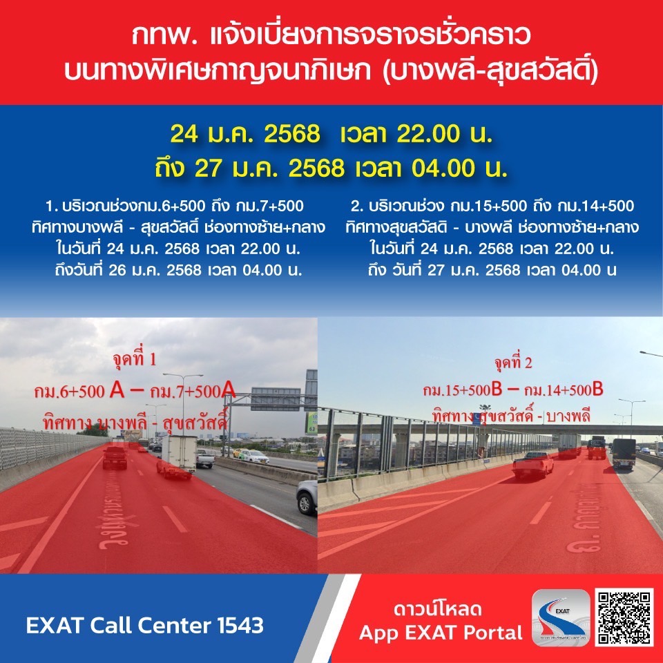 - บริเวณช่วงกม.6+500 ถึง กม.7+500 ทิศทางบางพลี – สุขสวัสดิ์ ช่องทางซ้าย+กลาง ในวันที่ 24 ม.ค. 2568 เวลา 22.00 น. ถึงวันที่ 26 ม.ค. 2568 เวลา 04.00 น.
