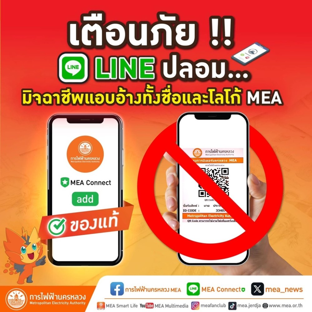 นายคมกริช สาคริก ผู้อำนวยการฝ่ายสื่อสารองค์กร MEA หรือการไฟฟ้านครหลวง กล่าวว่า MEA มีความห่วงใยเตือนประชาชนระมัดระวังกลุ่มมิจฉาชีพหลอกลวงผู้ใช้ไฟฟ้าบริการติดตั้งมิเตอร์ไฟฟ้าฟรี หลอกให้กดลิงก์และขอข้อมูลผ่านทาง Line โดยหากประชาชนหลงเชื่อ กดลิงก์และให้ข้อมูลจะมีความเสี่ยงทำให้เสียทรัพย์ได้ MEA ขอชี้แจงช่องทางให้บริการ เพื่อป้องกันมิจฉาชีพแอบอ้าง LINE MEA Connect ของแท้จะมีโล่สีเขียว นำหน้าชื่อ MEA Connect เท่านั้น ทั้งนี้หากผู้ใช้ไฟฟ้าพบกลุ่มมิจฉาชีพแอบอ้างหลอกลวงทำให้เสียทรัพย์ ให้รีบแจ้งเจ้าหน้าที่ตำรวจในพื้นที่ รวมถึงระมัดระวังการรับข้อมูลจากช่องทางการสื่อสารในสื่อโซเชียลมีเดียต่าง ๆ ซึ่งอาจมีการนำเสนอข้อมูลที่ไม่ถูกต้อง