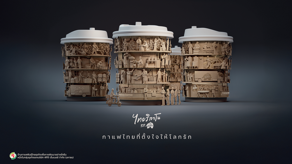 คุณกนิษฐ์ มิ่งเมือง Executive Creative Director Wolf BKK เล่าถึงแรงบันดาลใจในการสร้างสรรค์ผลงานว่า “สิ่งแรกที่เราได้ฟังจากทีมพันธุ์ไทย คือความตั้งใจที่อยากสร้างกาแฟแห่งชาติ กาแฟเพื่อคนไทย สร้างจากคนไทย และเป็นราคาที่เข้าถึงง่าย ดื่มได้ทุกคน จากความตั้งใจนี้เราจึงค้นพบว่ามันมีความใส่ใจที่มากกว่าขั้นตอนการปลูก หรือการชง เช่น การคัดเมล็ดด้วยมือ การคั่วกาแแฟ การขนส่งจากที่เพาะปลูก หรือแม้แต่การเก็บรักษา พิถีพิถันในทุกๆ ขั้นตอน เพื่อให้ได้รสชาติ และรสสัมผัสของ ไทยริกาโน ที่ดีที่สุดในทุกแก้ว เราจึงอยากให้ความสำคัญกับทุกรายละเอียด และอยากทำให้ทุกคนที่มีส่วนร่วมอยู่ในความงามบนแก้วกาแฟใบนี้ ซึ่งแม้แต่การเลือกใช้วัสดุแก้วกระดาษที่ย่อยสลายได้ และนำมาเล่าผ่านภาพที่ถูกสร้างโดยวิธีการราวกับการแกะสลัก ก็เพื่อทำให้เห็นว่าผลงานชิ้นนี้ก็เป็นส่วนหนึ่งของความใส่ใจด้วยเหมือนกันยิ่งไปกว่านั้น เราอยากให้ทุกคนที่ได้ดื่มกาแฟแก้วนี้ รู้สึกถึงความตั้งใจของคนไทยจริงๆ ”