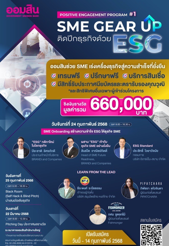 กิจกรรม SME Gear Up ติดปีกธุรกิจด้วย ESG เปิดให้ผู้ประกอบการ SME ที่ดำเนินงานสอดคล้องหรือมีศักยภาพในการพัฒนาธุรกิจโดยใช้แนวคิด ESG สมัครเข้าร่วมโครงการฯ สำหรับลูกค้าสินเชื่อธุรกิจ SME ของธนาคารออมสิน มีวงเงินสินเชื่อตั้งแต่ 50 – 250 ล้านบาท สำหรับผู้ประกอบการ SME ทั่วไป มีรายได้รวม 100 – 500 ล้านบาทต่อปี โดยผู้ประกอบการ SME ที่สมัครและผ่านการคัดเลือกในรอบแรก จะได้เข้าร่วมกิจกรรม SME Onboarding การอบรมให้ความรู้ ความเข้าใจในประเด็น ESG ผ่านมุมมองของธุรกิจ การศึกษา ESG Standard ตลอดจนการรับฟังกรณีศึกษาจากผู้ประกอบการ SME ต้นแบบ (Learn from the lead) ที่มีการดำเนินงานด้าน ESG อย่างเป็นรูปธรรมจนประสบความสำเร็จ และการนำเสนอไอเดียธุรกิจ เพื่อเฟ้นหาสุดยอดไอเดียธุรกิจ SME ลุ้นรับเงินรางวัลรวมมูลค่า 660,000 บาท โดยผู้ประกอบการ SME ที่ร่วมโครงการ ยังจะได้รับสิทธิพิเศษในการทำธุรกรรม/ยื่นสินเชื่อกับธนาคาร พร้อมรับประกาศนียบัตร ตรารับรองคุณวุฒิ และสิทธิพิเศษอื่น ๆ