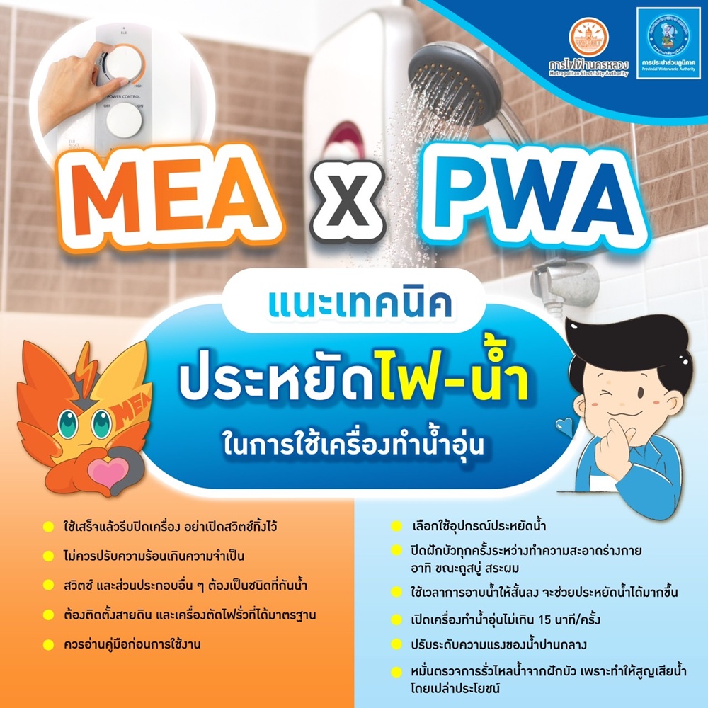 MEA หรือการไฟฟ้านครหลวง ร่วมกับ PWA หรือการประปาส่วนภูมิภาค (กปภ.) ในฐานะหน่วยงานรัฐวิสาหกิจสังกัดกระทรวงมหาดไทย มีหน้าที่ดูแลระบบความมั่นคงระบบไฟฟ้า และประปา ในพื้นที่ของประเทศไทย แนะเคล็ดลับประหยัดไฟ-น้ำ อย่างมีประสิทธิภาพ