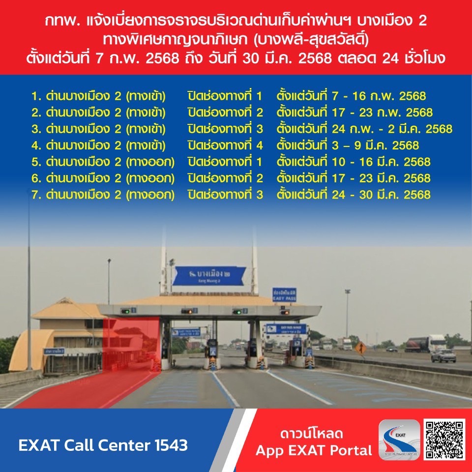1. ด่านบางเมือง 2 (ทางเข้า) ปิดช่องทางที่ 1 ตั้งแต่วันที่ 7 – 16 ก.พ. 2568