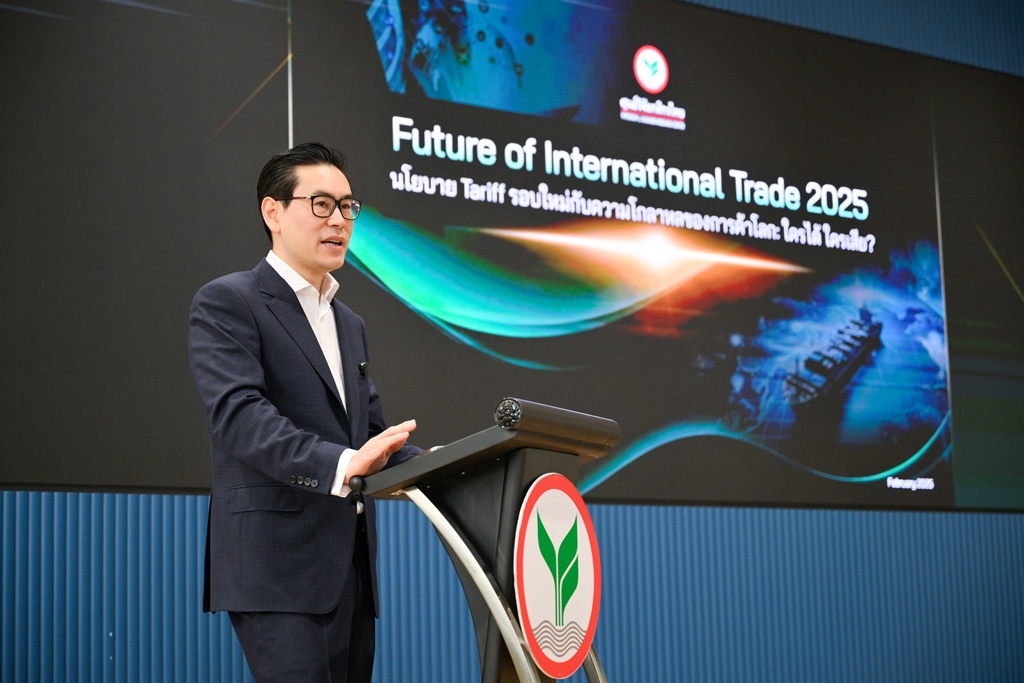 นายบุรินทร์ อดุลวัฒนะ กรรมการผู้จัดการ และ Chief Economist บริษัท ศูนย์วิจัยกสิกรไทย จำกัด บรรยายพิเศษ เรื่อง“Future of International Trade 2025 นโยบาย Tariff รอบใหม่กับความโกลาหลของการค้าโลก ใครได้ ใครเสีย?” มอง นโยบายทรัมป์ 2.0 จะยังคงใช้ภาษีนำเข้าเป็นเครื่องมือประโยชน์สูงสุดต่อสหรัฐฯ ขณะที่ประเทศไทย น่าจะได้รับผลกระทบอย่างหลีกเลี่ยงไม่ได้ จากการที่ไทยเกินดุลการค้ากับสหรัฐฯ เป็นอันดับที่ 10 ของโลก แนะไทยใช้กลยุทธ์เปิดตลาดให้กับธุรกิจสหรัฐฯ มากขึ้น หรือเพิ่มการนำเข้าสินค้าของสหรัฐฯ เพื่อเป็นการลดการได้ดุลการค้ากับสหรัฐฯ ณ CO-WORKING SPACE ชั้น G ธนาคารกสิกรไทย สำนักงานใหญ่ พหลโยธิน