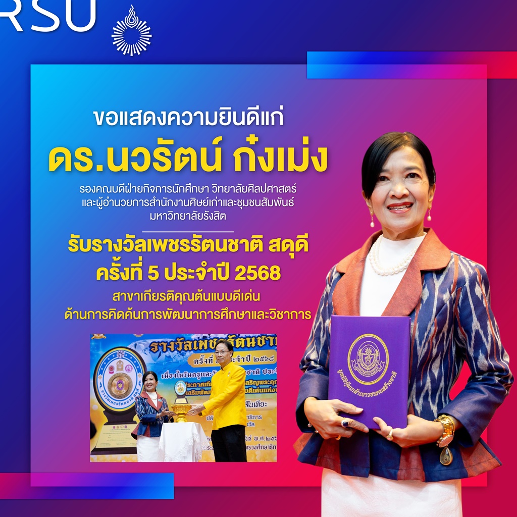 ดร.นวรัตน์ ก๋งเม่ง รองคณบดีฝ่ายกิจการนักศึกษา วิทยาลัยศิลปศาสตร์ และผู้อำนวยการสำนักงานศิษย์เก่าและชุมชนสัมพันธ์ มหาวิทยาลัยรังสิต ได้รับรางวัลเพชรรัตนชาติ สดุดี ครั้งที่ 5 ประจำปี 2568 ประกาศเกียรติคุณสรรเสริญพระคุณครู ส่งเสริมพัฒนาเด็กต้นแบบดีเด่นแห่งชาติ สาขาเกียรติคุณต้นแบบดีเด่น ด้านการคิดค้นการพัฒนาการศึกษาและวิชาการ เนื่องในวันครูและวันเด็กแห่งชาติ ประจำปี 2568 จัดโดย มูลนิธิคุ้มเกล้าเยาวชนคนสร้างชาติ ร่วมกับ กระทรวงศึกษาธิการ กระทรวงการพัฒนาสังคมและความมั่นคงของมนุษย์ สำนักงานพระพุทธศาสนาแห่งชาติ วัดสิรินธรเทพรัตนาราม ในพระราชูปถัมภ์ กรมสมเด็จพระเทพรัตนราชสุดาฯ สยามบรมราชกุมารี จังหวัดนครปฐม และภาคีเครือข่าย ณ หอประชุมคุรุสภา กระทรวงศึกษาธิการ