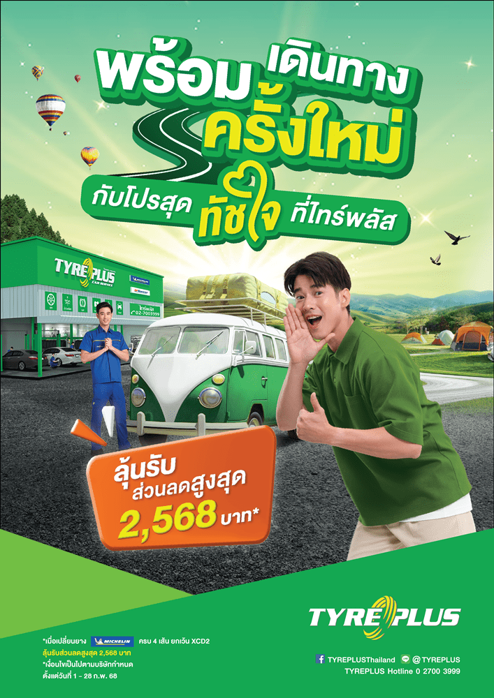 ไทร์พลัส ศูนย์บริการรถยนต์ครบวงจร จัดโปรโมชั่นร่วมแคมเปญ ‘Easy E-Receipt 2.0’ ให้ลูกค้าคนพิเศษ เพียงซื้อยางมิชลินรุ่นใดก็ได้ (ยกเว้น MICHELIN XCD2) จำนวน 4 เส้น ลุ้นรับส่วนลดมูลค่า 2,568 บาท และ 800 บาท พร้อมรับสิทธิ์ลดหย่อนภาษีสูงสุด 30,000 บาท ตั้งแต่วันนี้ถึง 28 กุมภาพันธ์ 2568 ที่ศูนย์บริการไทร์พลัสทั่วประเทศ