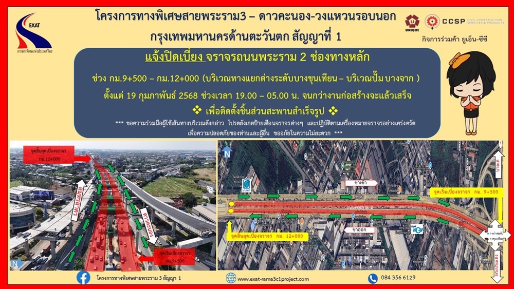 การทางพิเศษแห่งประเทศไทย (กทพ.) กระทรวงคมนาคม ได้ว่าจ้างกิจการร่วมค้า ยูเอ็น – ซีซี เป็นผู้รับจ้างดำเนินโครงการทางพิเศษสายพระราม 3 – ดาวคะนอง – วงแหวนรอบนอกกรุงเทพมหานคร ด้านตะวันตก สัญญาที่ 1 โดยผู้รับจ้างจะเข้าดำเนินการติดตั้งชิ้นส่วนสะพานสำเร็จรูป ดังนั้น เพื่อเร่งติดตั้งชิ้นส่วนสะพานดังกล่าวให้แล้วเสร็จโดยเร็ว จึงมีความจำเป็นจะต้องปิดเบี่ยงจราจรถนนพระราม 2 ช่องทางหลักทั้งฝั่งขาเข้า-ขาออก กม.9+500 ถึง กม.12+000 (บริเวณทางแยกต่างระดับบางขุนเทียน – บริเวณปั๊มบางจาก) ช่วงเวลา 19.00 – 05.00 น. ตั้งแต่วันที่ 19 กุมภาพันธ์ 2568 จนกว่าจะดำเนินการก่อสร้างแล้วเสร็จ