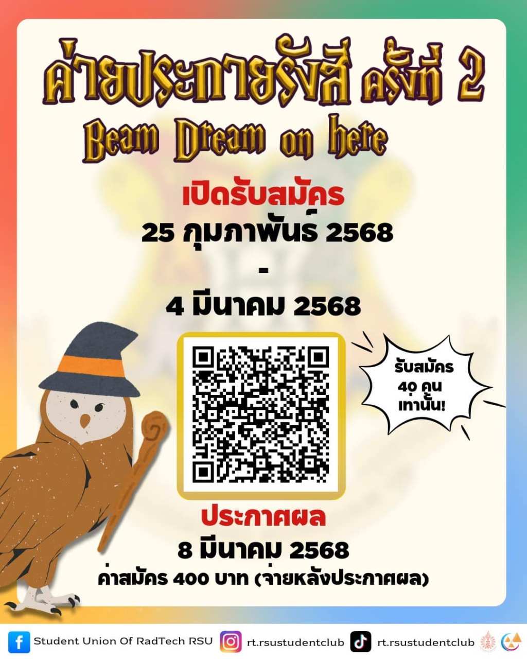 คณะรังสีเทคนิค มหาวิทยาลัยรังสิต จัดกิจกรรม “ค่ายประกายรังสี ครั้งที่ 2” Beam Dream on here ในวันที่ 5 เมษายน 2568 ณ อาคาร 10 ชั้น10 คณะรังสีเทคนิค มหาวิทยาลัยรังสิต โดยเปิดรับสมัครตั้งแต่บัดนี้ถึงวันที่ 4 มีนาคม 2568 ประกาศผลวันที่ 8 มีนาคม 2568 ค่าสมัคร 400 บาท (ชำระหลังประกาศผล)