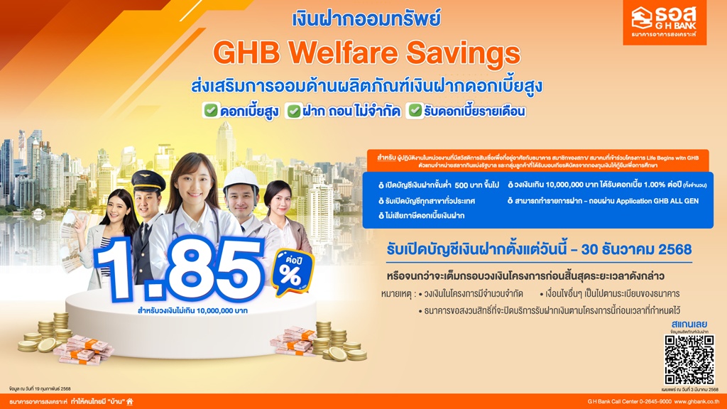 ให้ผลตอบแทนอัตราดอกเบี้ยสูงถึง 1.85% ต่อปี ธนาคารอาคารสงเคราะห์ (ธอส.) จัดทำผลิตภัณฑ์ทางการเงินที่ให้ผลตอบแทนสูง เอาใจคนรักการออม สำหรับผู้ปฏิบัติงานในหน่วยงานที่เข้าร่วมโครงการสวัสดิการสินเชื่อเพื่อที่อยู่อาศัยกับธอส.หรือสมาชิกของสภา/สมาคมวิชาชีพที่เข้าร่วมโครงการ Life Begins with GHB, ตัวแทนจำหน่ายสลากกินแบ่งรัฐบาลและกลุ่มลูกค้าที่ได้รับมอบเกียรติบัตร จากกองทุนให้กู้ยืมเพื่อการศึกษา กับ “เงินฝากออมทรัพย์GHBWelfare Savings” ที่ให้อัตราดอกเบี้ยถึง 1.85% ต่อปี (สำหรับผู้ที่มีวงเงินฝากคงเหลือไม่เกิน10 ล้านบาท) เพียงเปิดบัญชีขั้นต่ำ 500 บาทขึ้นไป ณ สาขาธนาคารทั่วประเทศ ตั้งแต่วันนี้ถึงวันที่30 ธันวาคม 2568 หรือจนกว่าจะเต็มกรอบวงเงินโครงการก่อนสิ้นสุดระยะเวลาดังกล่าว โดยลูกค้าจะได้รับดอกเบี้ยรายเดือน และสำหรับลูกค้าบุคคลธรรมดาได้รับการยกเว้นภาษีดอกเบี้ยเงินฝาก โดยผู้ที่สนใจเงินฝากออมทรัพย์ GHB Welfare Savings
