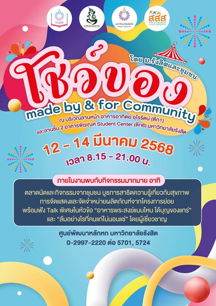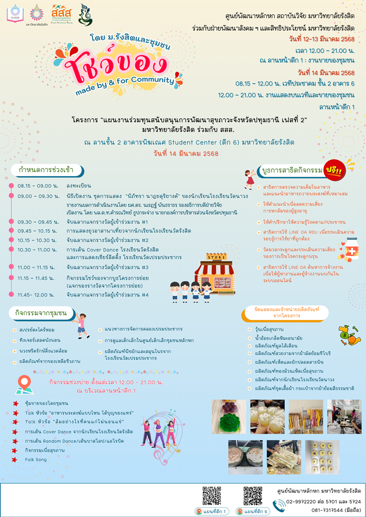 ศูนย์พัฒนาหลักหก สถาบันวิจัย มหาวิทยาลัยรังสิต ขอเชิญร่วมงาน “โชว์ของ made by & for Community โดย ม.รังสิตและชุมชน” ภายใต้โครงการ “แผนงานร่วมทุนสนับสนุนการพัฒนาสุขภาวะจังหวัดปทุมธานี เฟสที่ 2” มหาวิทยาลัยรังสิต ร่วมกับ สำนักงานกองทุนสนับสนุนการสร้างเสริมสุขภาพ (สสส.) ในวันที่ 12 – 13 มีนาคม 2568 เวลา 12.00 – 21.00 น. บริเวณลานหน้า อาคารอาทิตย์ อุไรรัตน์ (ตึก1) มหาวิทยาลัยรังสิต และวันที่ 14 มีนาคม 2568 เวลา 08.15 – 12.00 น. ณ ลานชั้น 2 อาคารพิฆเณศ Student Center (ตึก6) มหาวิทยาลัยรังสิต