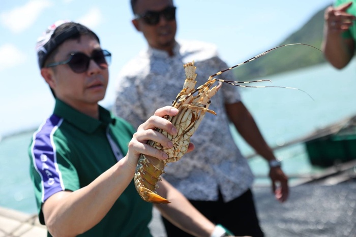 จากนั้นได้เดินทางไปเยี่ยมการเลี้ยงกุ้งมังกรและการเลี้ยงปลาช่อนทะเลในกระชัง ของนายอนันต์ หาญจิตร ลูกค้าเกษตรกร ธ.ก.ส. บ้านคลองเหีย เกาะยาวน้อย นับเป็นเอกลักษณ์บนเกาะยาวน้อย โดยเฉพาะกุ้งมังกรเจ็ดสี ที่นิยมเลี้ยงมากที่สุดถือเป็นสัตว์เศรษฐกิจที่สร้างรายได้แก่ครัวเรือนและคนในชุมชน เนื่องจากพบมากในกระแสน้ำอุ่นของมหาสมุทรแปซิฟิกและมหาสมุทรอินเดียที่สามารถดึงดูดให้นักท่องเที่ยวทั้งในและนอกประเทศแวะมาเยี่ยมเยียนอย่างต่อเนื่อง สำหรับผู้ที่สนใจลองสัมผัสและเรียนรู้วิถีชีวิตพื้นถิ่นพร้อมเยี่ยมชมสินค้าสามารถติดต่อสอบถามเพิ่มเติมได้ที่ ชุมชนท่องเที่ยวบ้านท่าเขา เกาะยาวน้อย โทร 089-6461891 หรือ Facebook : ชุมชนท่องเที่ยว O T O P นวัตวิถี บ้านท่าเขา จ.พังงา และ Facebook : Takao Batik – ผ้าบาติก บ้านท่าเขา