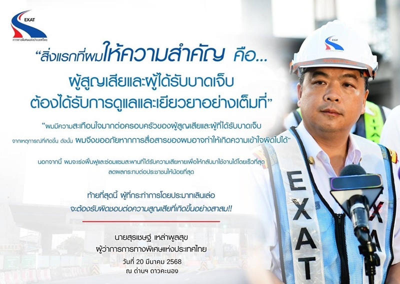 “ผมขอยืนยันว่า ทุกกระบวนการและทุกขั้นตอนของการดำเนินการก่อสร้างนั้น ได้เน้นย้ำและให้ความสำคัญในมาตรการด้านความปลอดภัยสูงสุด โดยกระทรวงคมนาคมและทุกหน่วยงานที่เกี่ยวข้อง จะดำเนินการแก้ไขข้อบกพร่อง เพื่อไม่ให้เกิดอุบัติซ้ำอีกเด็ดขาด เพื่อความปลอดภัยและความสะดวกในการเดินทางของพี่น้องประชาชน” นายกฤชนนท์ กล่าว