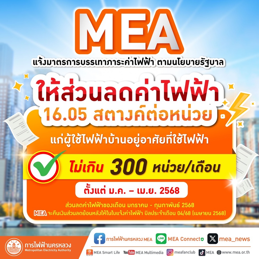 ตามที่ประชุมคณะรัฐมนตรี (ครม.) ในคราวประชุมวันที่ 11 มีนาคม 2568 มีมติเห็นชอบในหลักการมาตรการลดภาระค่าใช้จ่ายด้านพลังงานให้แก่ประชาชนตามที่กระทรวงพลังงานเสนอ จากมาตรการเดิมที่ดำเนินการมาตั้งแต่เดือนกันยายน 2567 และสิ้นสุดลง เมื่อเดือนธันวาคม 2567 เพื่อบรรเทาผลกระทบต่อภาระค่าครองชีพของประชาชนและการฟื้นตัวทางเศรษฐกิจของประเทศ โดยในส่วนมาตรการด้านไฟฟ้า ให้ส่วนลดค่าไฟฟ้าจำนวน 16.05 สตางค์ต่อหน่วย สำหรับผู้ใช้ไฟฟ้าประเภทบ้านอยู่อาศัยที่ใช้ไฟฟ้าไม่เกิน 300 หน่วยต่อเดือน เป็นเวลา 4 เดือน ตั้งแต่ค่าไฟฟ้าประจำเดือนมกราคม – เมษายน 2568 ทั้งนี้ ส่วนลดค่าไฟฟ้าของเดือน มกราคม – กุมภาพันธ์ 2568 MEA จะคืนเงินส่วนลดย้อนหลังให้ในใบแจ้งค่าไฟฟ้า บิลประจำเดือน 04/68 (เมษายน 2568) (อ่านรายละเอียดการประชุมคณะรัฐมนตรี วันที่ 11 มีนาคม 2568 คลิก>> https://www.thaigov.go.th/news/contents/details/94263