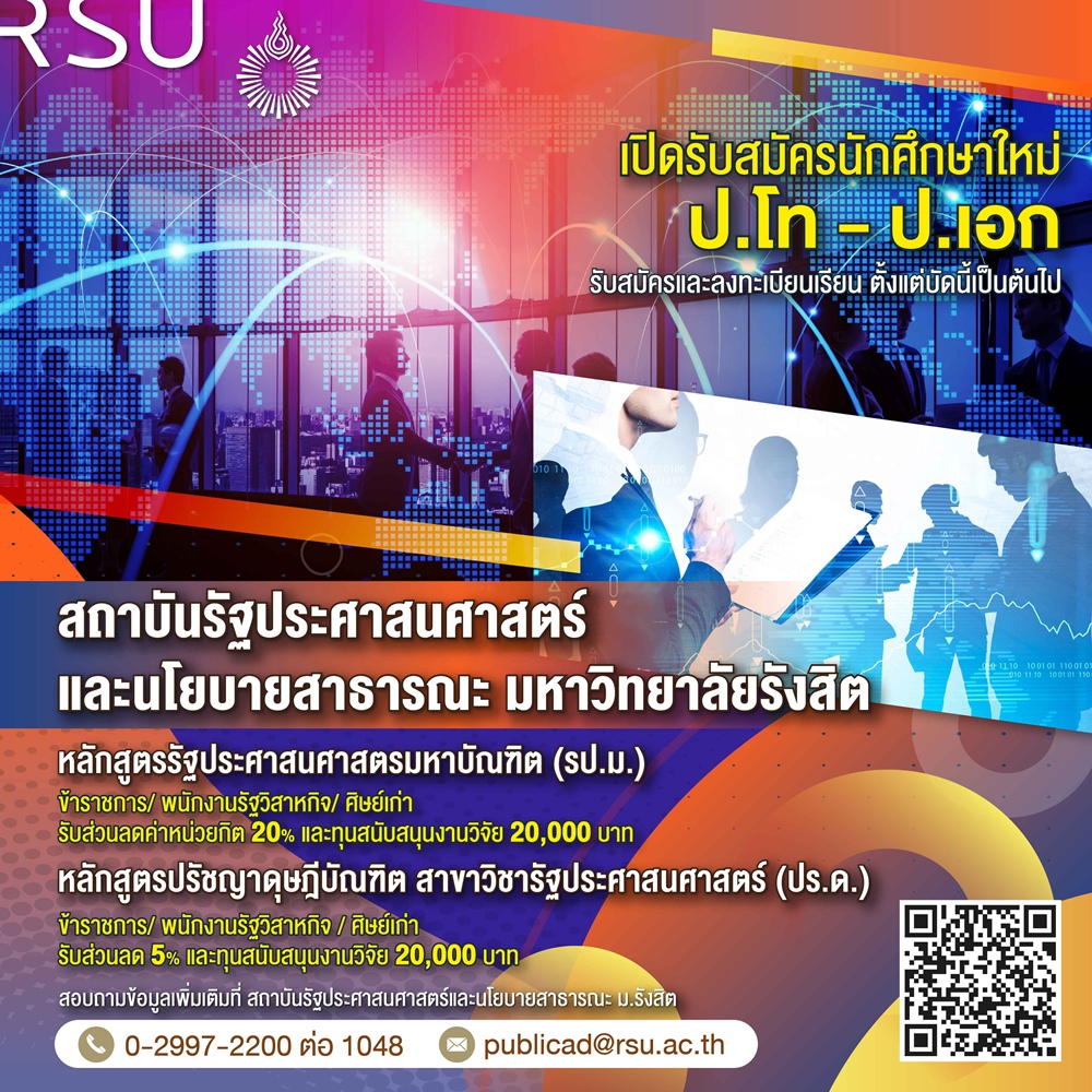 สถาบันรัฐประศาสนศาสตร์และนโยบายสาธารณะ มหาวิทยาลัยรังสิต เปิดรับสมัครนักศึกษาใหม่ในระดับปริญญาโทและปริญญาเอก โดยมีรายละเอียด ดังนี้ หลักสูตรรัฐประศาสนศาสตรมหาบัณฑิต (รป.ม.) ข้าราชการ พนักงานรัฐวิสาหกิจ และศิษย์เก่ามหาวิทยาลัยรังสิต รับส่วนลดค่าหน่วยกิต 20% และทุนสนับสนุนงานวิจัย 20,000 บาท และหลักสูตรปรัชญาดุษฎีบัณฑิต สาขาวิชารัฐประศาสนศาสตร์ (ปร.ด.) ข้าราชการ พนักงานรัฐวิสาหกิจ และศิษย์เก่ามหาวิทยาลัยรังสิต รับส่วนลด 5% และทุนสนับสนุนงานวิจัย 20,000 บาท โดยสามารถสมัครและลงทะเบียนเรียนได้ตั้งแต่บัดนี้เป็นต้นไป