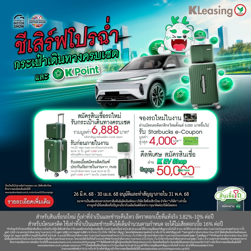 KASIKORN LEASING Co., Ltd. (KLeasing) anticipates that the 46th Bangkok International Motor Show will help boost car sales in 2025. To elevate the customer experience through comprehensive digital auto loan solutions, KLeasing in collaboration with KBank Credit Card will be offering customers special deals, including a complete luggage set, K POINT rewards, and Starbucks e-coupons, along with exclusive privileges for those applying for Auto Loan (New Car) at the event.