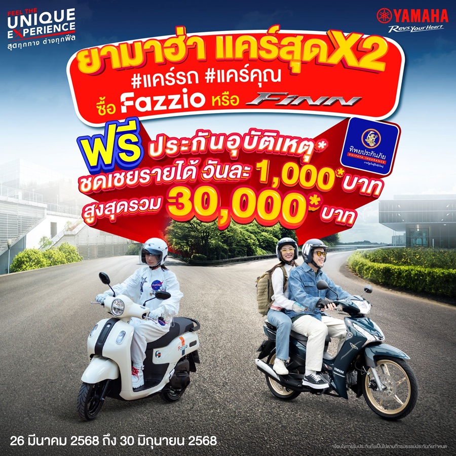 จัดโปรโมชัน สุดพิเศษ “แคร์สุดx2” มอบความคุ้มครองเหนือระดับให้ลูกค้าคนสำคัญ เมื่อซื้อรถจักรยานยนต์ YAMAHA FAZZIO หรือ YAMAHA FINN มอบประกันอุบัติเหตุ สูงสุด 5,000 บาท/ปี และคุ้มครองการชดเชยรายได้ระหว่างพักรักษาตัวในโรงพยาบาล 1,000 บาท/วัน (สูงสุด 3 วัน/อุบัติเหตุแต่ละครั้ง และไม่เกิน 30 วัน/ปี) ตั้งแต่วันที่ 26 มีนาคม ถึง วันที่ 30 มิถุนายน 2568 สอบถามรายละเอียดเพิ่มเติมได้ที่ https://www.dhipaya.co.th หรือ โทร. 1736
