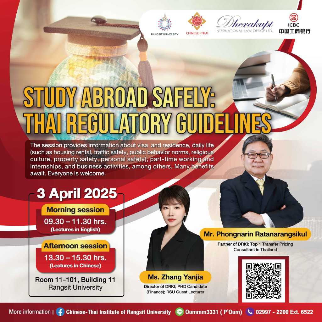 สถาบันจีน – ไทยแห่งมหาวิทยาลัยรังสิต จัดสัมมนาเรื่อง “ความรู้กฎหมายไทยสำหรับนักศึกษาต่างชาติในมหาวิทยาลัยรังสิต” และ เรื่อง “การป้องกันการฉ้อโกงทางการเงิน” ในวันพฤหัสบดีที่ 3 เมษายน 2568 เวลา 09.30 – 15.30 น. ณ ห้อง11-101 อาคารรัตนคุณากร (อาคาร 11) มหาวิทยาลัยรังสิต ภายในงานได้รับเกียรติจากบริษัทสำนักกฎหมายสากล ธีรคุปต์ จำกัด และธนาคารพาณิชย์อุตสาหกรรมแห่งประเทศจีน (ICBC) เป็นวิทยากรให้ความรู้ (บรรยายสองภาษา)
