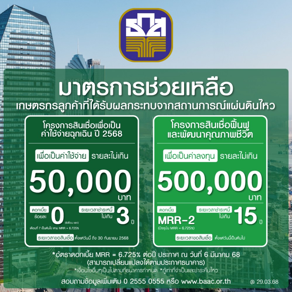 นายฉัตรชัย ศิริไล ผู้จัดการ ธนาคารเพื่อการเกษตรและสหกรณ์การเกษตร (ธ.ก.ส.) เปิดเผยว่าจากสถานการณ์แผ่นดินไหวในสาธารณรัฐแห่งสหภาพเมียนมา เมื่อวันที่ 28 มีนาคมที่ผ่านมา ทำให้เกิดแรงสั่นสะเทือนในหลายพื้นที่ของประเทศไทย ได้แก่ พื้นที่ภาคเหนือ กรุงเทพมหานครและปริมณฑล ซึ่งสร้างความเสียหายต่อที่อยู่อาศัย ทรัพย์สินและพื้นที่การเกษตร ส่งผลกระทบต่อการใช้ชีวิตและการประกอบอาชีพของเกษตรกรโดยตรง ดังนั้น เพื่อเป็นการช่วยเหลือและบรรเทาความเดือดร้อนดังกล่าวอย่างเร่งด่วน ธ.ก.ส. ได้จัดโครงการสินเชื่อเพื่อเป็นค่าใช้จ่ายฉุกเฉิน วงเงินรายละไม่เกิน 50,000 บาท อัตราดอกเบี้ย 0% 6 เดือนแรก เดือนที่ 7 คิดอัตราดอกเบี้ย MRR (ปัจจุบัน MRR เท่ากับ 6.725%) และโครงการสินเชื่อฟื้นฟูและพัฒนาคุณภาพชีวิต วงเงินรายละไม่เกิน 500,000 บาท อัตราดอกเบี้ย MRR ลบ 2 % ต่อปี วงเงินรวม 20,000 ล้านบาท เพื่อสนับสนุนให้ลูกค้าเข้าถึงเงินทุนอัตราดอกเบี้ยต่ำในการฟื้นฟูความเสียหายที่ได้รับผลกระทบจากภัยพิบัติธรรมชาติ สำหรับนำไปเป็นค่าใช้จ่ายในการปรับปรุงหรือซ่อมแซมที่อยู่อาศัย โรงเรือนการเกษตร หรือเครื่องจักรกลการเกษตร รวมถึงส่งเสริมให้เกษตรกรลูกค้าสามารถลดภาระด้านต้นทุนการผลิตและมีเงินทุนหมุนเวียนในกรณีฉุกเฉินในระหว่างการฟื้นฟูจนสามารถกลับมาประกอบอาชีพและดำเนินธุรกิจตามปกติต่อไปได้อย่างเข้มแข็ง