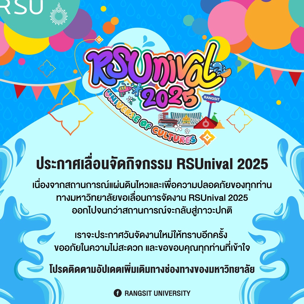 ทางมหาวิทยาลัยขอเลื่อนการจัดงานRSUnivals 2025 ออกไปจนกว่าสถานการณ์จะกลับสู่ภาวะปกติ
