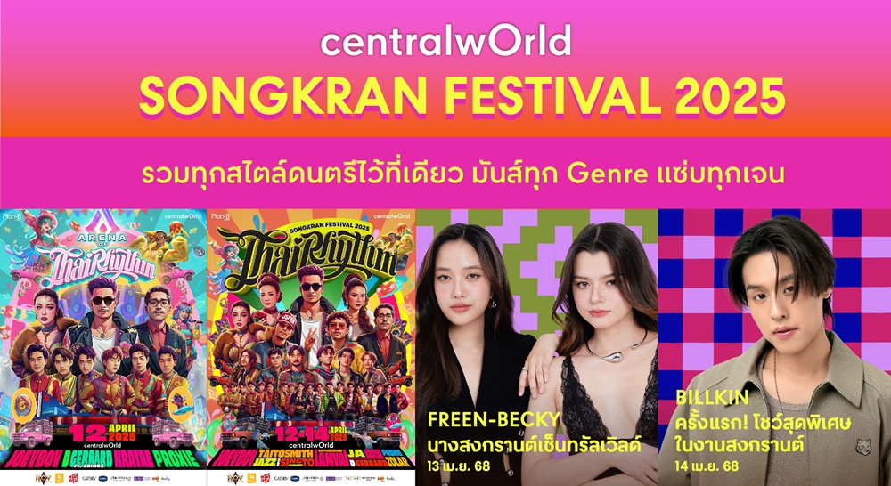 - ‘เซ็นทรัลเวิลด์’ หนึ่งเดียวแลนด์มาร์กสงกรานต์ระดับโลกใจกลางเมืองกับงาน centralwOrld Songkran Fest 2025: ผนึกพันธมิตรยักษ์ใหญ่ จัดเต็มความสนุกตลอด 6 วันเต็ม ทั้ง Thai Rhythm Songkran Festival 2025 วันที่ 12-14 เม.ย. 68 ที่ยกขบวนศิลปินสายโจ๊ะกว่า 300 ชีวิต นำโดย โจอี้ บอย, กระแต อาร์สยาม, PROXIE, D Gerrard x Zbing Z., แจ๊ส สปุ๊กนิค ปาปิยอง กุ๊กกุ๊ก, ลำไย ไหทองคำ, สิงโต นำโชค, ไททศมิตร, จ๊ะ นงผณี, ZOLAR, The Voice พร้อมกิจกรรมไทยสุดม่วนแบบจัดเต็มทั้งเวทีรำวงสุดแกลมที่ใหญ่ที่สุดในกรุงเทพฯ, สาวน้อยตกน้ำ และ Giant Slider สไลเดอร์ยักษ์ ที่จะกลับมาสร้างความชุ่มฉ่ำใจกลางเมืองอีกครั้ง ต่อด้วยงานคอนฯใหญ่ FWD Music Live Fest ครั้งที่ 4 ฟรีคอนเสิร์ตเล่นน้ำ ใจกลางลานหน้าเซ็นทรัลเวิลด์ วันที่ 18–20 เม.ย. ที่ยกทัพศิลปิน T-POP และ J-POP กว่า 60 ชีวิตมาสร้างความสนุกแบบฉ่ำสุดโมเมนต์ นำโดย Jeff Satur, PROXIE, 4EVE, Three Man Down,Tilly Birds, PERSES,THE TOYS, Tattoo Colour, PRETZELLE, ZOLAR, WOLF HOWL HARMONY และอีกมากมาย ตอกย้ำตำแหน่ง The No.1 Culturetainment Landmark ที่รวมทุกจังหวะความสนุกของเทศกาลสงกรานต์ไว้ในที่เดียวอย่างแท้จริง