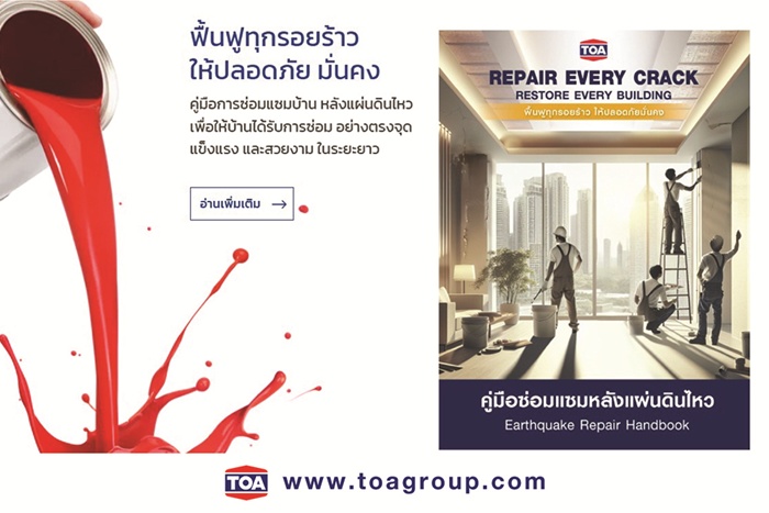 จากเหตุการณ์แผ่นดินไหวในประเทศเมียนมา ที่ส่งผลกระทบต่อประเทศไทย ทำให้อาคารแนวสูงหลายแห่งได้รับความเสียหาย บริษัท ทีโอเอ เพ้นท์ (ประเทศไทย) จำกัด (มหาชน) หรือ TOA ในฐานะผู้ผลิตและผู้เชี่ยวชาญในอุตสาหกรรมสีทาอาคาร – วัสดุปกป้องพื้นผิวครบวงจร ทั้งเคมีภัณฑ์ก่อสร้าง กระเบื้อง และแผ่นฝ้ายิปซัม ขอยืนหยัดเคียงข้างประชาชน ยืนยันไม่ขึ้นราคาสินค้า – ผนึกกำลังภาคอสังหาฯ ส่งทีมผู้เชี่ยวชาญลงพื้นที่ประเมินความเสียหายรอยแตกร้าว พร้อมแจกคู่มือประชาชนฉบับพิเศษ “การซ่อมแซมหลังแผ่นดินไหว”