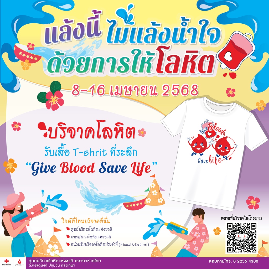 ศูนย์บริการโลหิตแห่งชาติ สภากาชาดไทย ชวนคนไทย ร่วมทำบุญบริจาคโลหิตต้อนรับปีใหม่ไทย ในโครงการ “แล้งนี้ ไม่แล้งน้ำใจ ด้วยการให้โลหิต” ระหว่างวันที่ 8 – 16 เมษายน 2568 เตรียมความพร้อมสำรองโลหิตรับมือหยุดยาวช่วงเทศกาลสงกรานต์ บริจาคโลหิต ณ ศูนย์บริการโลหิตแห่งชาติ หน่วยรับบริจาคโลหิตประจำที่ (Fixed Station) ภาคบริการโลหิตแห่งชาติ 12 แห่งทั่วประเทศ โรงพยาบาลสาขาบริการโลหิต 8 แห่งในกรุงเทพมหานคร รับเสื้อยืด “Give Blood Save Life” เป็นที่ระลึกแทนคำขอบคุณ