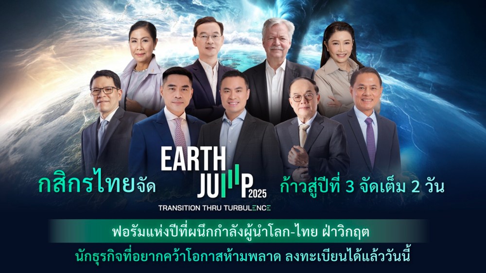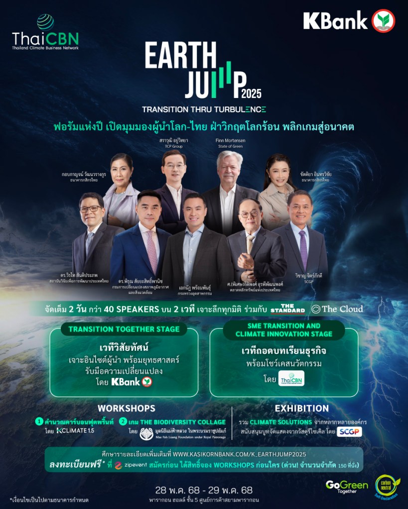 เปิดให้ลงทะเบียนแล้ว EARTH JUMP 2025 ฟอรัมแห่งปีจากธนาคารกสิกรไทย ต่อเนื่องเป็นปีที่ 3 ภายใต้แนวคิด TRANSITION THRU TURBULENCE ผนึกกำลังผู้นำระดับโลกและระดับประเทศร่วมกันพาธุรกิจฝ่าวิกฤต สร้างแต้มต่อในเกมแห่งอนาคตหลังจากงานปีที่แล้วประสบความสำเร็จอย่างล้นหลาม ในปีนี้จึงกลับมาอย่างยิ่งใหญ่กว่าเดิม จัดเต็มสาระความรู้และการนำเสนอนวัตกรรมตลอด 2 วัน กับผู้นำระดับโลกและระดับประเทศกว่า 40 ท่าน บน 2 เวที คือ เวทีเปิดวิสัยทัศน์จากธนาคารกสิกรไทย และเวทีถอดบทเรียนธุรกิจและนวัตกรรมจาก ThaiCBN (Thailand Climate Business Network) นอกจากนี้ยังมี 2 เวิร์กช้อปให้ผู้ร่วมงานไปลองปฏิบัติเพื่อให้เปลี่ยนผ่านสู่ธุรกิจคาร์บอนต่ำได้จริง และมีโซนนิทรรศการ Climate Solutions จากองค์กรชั้นนำ ทำให้งาน EARTH JUMP 2025 ในปีนี้เป็นงานที่พลาดไม่ได้ โดยงานจะจัดขึ้นในวันที่ 28 – 29 พฤษภาคม 2568 เวลา 9.00 – 17.30 น. ณ พารากอน ฮอลล์ ชั้น 5 เปิดให้ลงทะเบียนร่วมงานฟรี!! ตั้งแต่วันนี้ – 27 พฤษภาคม 2568 ที่ Zipevent คลิก! https://earthjump.co/426OEPS สมัครก่อน ได้สิทธิ์จอง Workshops ก่อนใคร (ด่วน! จำนวนจำกัด) หรือศึกษารายละเอียดเพิ่มเติมที่ www.kasikornbank.com/k_earthjump2025