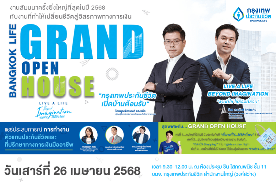 กรุงเทพประกันชีวิต เตรียมจัดงานสัมมนาครั้งยิ่งใหญ่ที่สุดในปี 2568 Bangkok Life Grand Open House นำโดย คุณจักรพงศ์ แสงแก้ว ผู้ช่วยผู้จัดการใหญ่ สายงานตัวแทนและที่ปรึกษาการเงิน ที่จะเปิดบ้านต้อนรับผู้บริหารตัวแทน ตัวแทนประกันชีวิตและที่ปรึกษาการเงิน ตลอดจนผู้มุ่งหวังที่จะเข้าสู่อาชีพนักขายรุ่นใหม่เพื่อร่วมเส้นทางกับงานที่จะทำให้เปลี่ยนชีวิตสู่อิสรภาพทางการเงิน พิเศษ ช่วง Special Talk กับ ดร.วิทย์ สิทธิเวคิน ผู้ดำเนินรายการชื่อดังของไทยจาก The Standard ในรายการ Morning Wealth และ 8 Minute ที่จะมาร่วมแชร์แนวคิดของ “งานที่ใช่ ใช้ชีวิตที่ชอบ: Live a Life Beyond Imagination” ในวันเสาร์ที่ 26 เมษายน 2568 ระหว่าง 9.30 – 12.00 น. ณ ห้องประชุม ชิน โสภณพนิช ชั้น 11 อาคารสำนักงานใหญ่ กรุงเทพประกันชีวิต (วงศ์สว่าง) พร้อมรับฟังความรู้อีกมากมายจากตัวแทนและที่ปรึกษาการเงินระดับท็อปของกรุงเทพประกันชีวิต ที่จะมาแลกเปลี่ยนประสบการณ์บนเส้นทางแห่งความสำเร็จ พร้อมเปิดมุมมองใหม่กับอาชีพที่สามารถก้าวข้ามทุกข้อจำกัดสู่ชีวิตดี ๆ แบบที่เคยฝันทั้งรายได้และอิสรภาพในการบริหารเวลา สามารถเติบโตก้าวหน้าได้ตามความสามารถ โดยผู้ร่วมงานคนใหม่ที่ยังไม่มีรหัสตัวแทน รับทันที เสื้อ T- Shirt “งานที่ใช่ ใช้ชีวิตที่ชอบ” พร้อมลุ้นของรางวัลมากมายในงาน สำหรับผู้บริหารที่ชวนผู้มุ่งหวังร่วมงาน รับทันทีกระเป๋าชอปปิง 1 ใบ