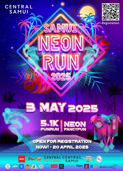Register to join the Central Samui Neon Run 2025 from today until April 30, 2025. The registration fee is 550 baht or 15 US dollars per person. Click https://race.thai.run/samuineonrun2025 Get fit and run together on Saturday, May 3, 2025. The event starts at 1:00 p.m. and runners will be released at 7:00 p.m. at Central Samui