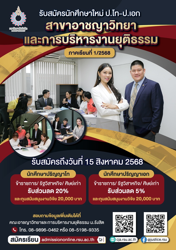 คณะอาชญาวิทยาและการบริหารงานยุติธรรม มหาวิทยาลัยรังสิต เปิดรับสมัครนักศึกษาระดับปริญญาโท และปริญญาเอก สาขาอาชญาวิทยาและการบริหารงานยุติธรรม ภาคเรียน 1/2568 สิทธิพิเศษสำหรับนักศึกษาปริญญาโท ข้าราชการ รัฐวิสาหกิจ และศิษย์เก่า รับส่วนลด 20% และทุนสนับสนุนงานวิจัย 20,000 บาท และนักศึกษาปริญญาเอก ข้าราชการ รัฐวิสาหกิจ และศิษย์เก่า รับส่วนลด 5% และทุนสนับสนุนงานวิจัย 20,000 บาท