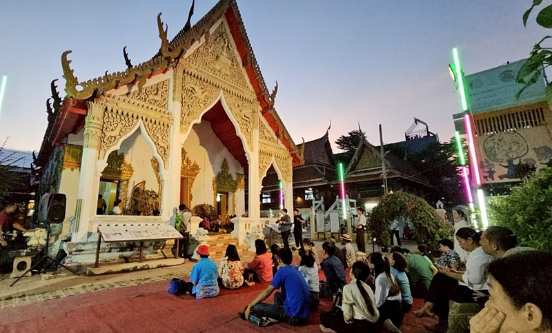 การเยือนชุมชนย่านเมืองเก่าริมน้ำเพชรบุรี อำเภอเมือง เริ่มต้นกิจกรรมจากที่พิพิธภัณฑ์หนังใหญ่วัดพลับพลาชัย ด้วยการเวิร์คช็อปเรียนรู้การตอกกระดาษ ก่อนจะพาคณะเดินชมชุมชนเก่าริมน้ำ เดินชมสตรีทอาร์ทและวิถีชุมชน นมัสการหลวงพ่อวัดมหาธาตุ ก่อนจะกลับมาทานอาหารในแบบขันโตกโดยนำเสนออาหารเชิงสุขภาพ พร้อมกับรับชมหนังใหญ่และการฝึกเชิดหนังใหญ่ การแสดงละครชาตรีละครพื้นบ้านที่ส่งต่อทางวัฒนธรรมจากเด็กๆ และชาวชุมชน นำโดยพี่น้อย – คุณรมยกรณ์ เอราวัณ