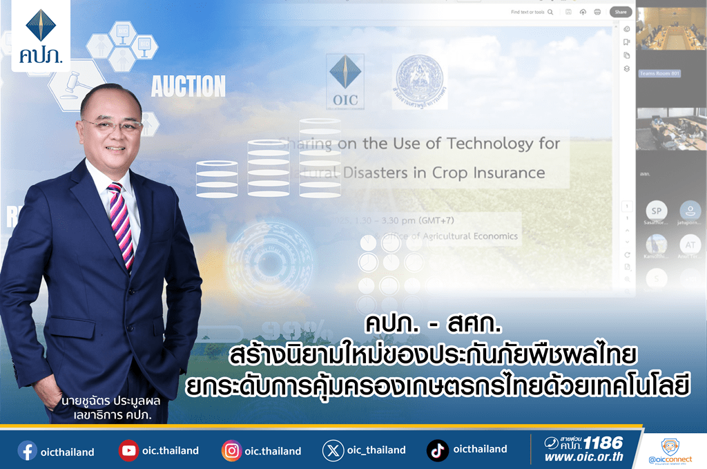 เมื่อวันที่ 7 พฤษภาคม 2568 นายชูฉัตร ประมูลผล เลขาธิการคณะกรรมการกำกับและส่งเสริมการประกอบธุรกิจประกันภัย (เลขาธิการ คปภ.) ได้ร่วมเปิดการประชุมเชิงปฏิบัติการผ่านระบบออนไลน์ ในหัวข้อ “Knowledge Sharing on the Use of Technology for Surveying Natural Disasters in Crop Insurance” จัดโดยสำนักงาน คปภ. ร่วมกับสำนักงานเศรษฐกิจการเกษตร (สศก.) นำโดย นายฉันทานนท์ วรรณเขจร เลขาธิการสำนักงานเศรษฐกิจการเกษตร พร้อมด้วยผู้แทนจากสมาคมประกันวินาศภัยไทย สมาคมนายหน้าประกันภัยไทย บริษัทประกันภัยต่อต่างประเทศ และบริษัทตัวแทนและนายหน้าประกันภัย เข้าร่วมแลกเปลี่ยนองค์ความรู้เพื่อยกระดับระบบประกันภัยพืชผลของประเทศไทยให้มีประสิทธิภาพมากยิ่งขึ้น