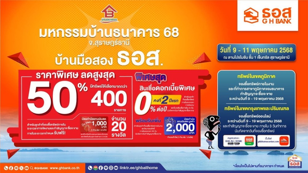 ธนาคารอาคารสงเคราะห์ (ธอส.) ชวนชาวใต้มีบ้านเป็นของตนเองได้ง่ายขึ้น ด้วยการร่วมงานมหกรรมบ้านธนาคาร 68 จ.สุราษฎร์ธานี ตั้งแต่วันนี้ – 11 พฤษภาคม 2568 ณ ลานโปรโมชัน ชั้น 1 เซ็นทรัล สุราษฎร์ธานี โดยนำทรัพย์เด่นกว่า 400 รายการทั่วประเทศ ทั้งประเภทบ้านเดี่ยว ทาวน์เฮ้าส์ และที่ดินเปล่ามาจำหน่ายในราคาพิเศษด้วยส่วนลดสูงสุดถึง 50% จากราคาปกติ ทั้งนี้ ผู้ที่สนใจซื้อทรัพย์ในเขตกรุงเทพและปริมณฑล สามารถจองซื้อทรัพย์ออนไลน์ ตั้งแต่วันนี้ –19 พฤษภาคม 2568 และทำสัญญาจะซื้อจะขายภายใน 3 วันทำการ นับถัดจากวันที่จองซื้อทรัพย์ และผู้ที่สนใจซื้อทรัพย์ในเขตภูมิภาค จองซื้อทรัพย์ภายในงานและที่ทำการสาขาภูมิภาคของธนาคาร โดยทำสัญญาจะซื้อจะขาย ตั้งแต่วันนี้ – 19 พฤษภาคม 2568 พิเศษ! สำหรับลูกค้าที่จองซื้อทรัพย์ภายในระยะเวลาการจัดงานและทำสัญญาจะซื้อจะขาย ภายใน 3 วันทำการ รับฟรีบัตรกำนัลแทนเงินสดมูลค่า 1,000 บาท จำนวน 20 รางวัล (1 ท่านต่อ 1 รางวัล : แบ่งเป็นทรัพย์ในเขตกรุงเทพและปริมณฑล และทรัพย์ในส่วนภูมิภาคอย่างละ 10 รางวัล)