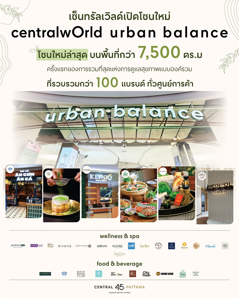 กรุงเทพฯ – บริษัท เซ็นทรัลพัฒนา จำกัด (มหาชน) ผู้นำเบอร์หนึ่งอสังหาริมทรัพย์ในไทยเพื่อความยั่งยืน ผู้บริหารศูนย์การค้าเซ็นทรัลเวิลด์ ไลฟ์สไตล์เดสติเนชันระดับโลกใจกลางเมือง เผยโฉม ‘Urban Balance’ โซนใหม่ล่าสุดบนพื้นที่กว่า 7,500 ตร.ม. บริเวณชั้น 5 ภายใต้แนวคิด The First Ultimate Wellness Oasis in the Heart of Bangkok ครั้งแรกของการรวมที่สุดแห่งการดูแลสุขภาพแบบองค์รวมใจกลางเมือง ที่รวบรวมกว่า 100 แบรนด์สุขภาพและไลฟ์สไตล์ชั้นนำ พร้อมเปิดตัว 26 แบรนด์ใหม่ในรูปแบบคอนเซ็ปต์สโตร์และแฟล็กชิปสโตร์ ครอบคลุมบริการด้านสุขภาพครบวงจร ทั้งคลินิก เวชกรรมทางเลือก เวลเนส สปา ฟิตเนส คาเฟ่ และร้านอาหารเพื่อสุขภาพ มุ่งสู่การเป็น Wellness Destination ใจกลางกรุงเทพฯ ที่ตอบโจทย์ทุกมิติของชีวิตยุคใหม่ ทั้งสุขภาพ ความงาม กีฬา อาหาร แฟชั่น และบริการเพื่อสุขภาพครบวงจร พร้อมเหล่าเซเลบริตี้คนดังจากวงการต่างๆ มาร่วมสัมผัสประสบการณ์แห่งการดูแลสุขภาพครบวงจร อาทิ โจ้-สืบศักดิ์ ผันสืบ, แอนนา เสืองามเอี่ยม, ดรีม-อภิชญา พานิชตระกูล, วินนี่-พีรภาส อัสสรัตนกุล, นัท-อภิวิชญ์ เอกธาราวงศ์, หมีพูห์-วิน สกุลแสงประภา และอีกมากมาย