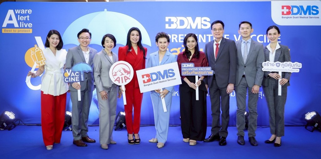 กรุงเทพฯ – เอไอเอ ประเทศไทย นำโดย นางสาวรพีพร วงศ์ทองคำ (ที่ 4 จากซ้าย) ผู้อำนวยการฝ่ายสื่อสารองค์กรและภาพลักษณ์ จับมือบริษัท กรุงเทพดุสิตเวชการ จำกัด (มหาชน) หรือ BDMS นำโดย นางนฤมล น้อยอ่ำ (กลาง) รองกรรมการผู้อำนวยการใหญ่อาวุโส และประธานเจ้าหน้าที่บริหารด้านการเงิน ร่วมเปิดแคมเปญ “BDMS PREVENTIVE VACCINE” มอบวัคซีนราคาพิเศษให้แก่ลูกค้าเอไอเอที่มีประกันสุขภาพ โดยครอบคลุม 4 โรคหลัก ได้แก่ ไข้หวัดใหญ่ ปอดอักเสบ ไข้เลือดออก และงูสวัด ซึ่งถือเป็นส่วนหนึ่งของโครงการ “Healthier You เริ่มต้นที่การฉีดวัคซีน” ที่เอไอเอ ต้องการรณรงค์สร้างเกราะป้องกันโรคให้แก่คนไทยอย่างต่อเนื่องตลอดทั้งปี ตอกย้ำถึงพันธกิจของเอไอเอ ที่มุ่งสนับสนุนผู้คนให้มีสุขภาพและชีวิตที่ดีขึ้น ตามคำมั่นสัญญา ‘Healthier, Longer, Better Lives’