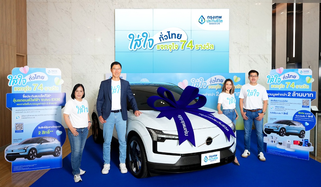 กรุงเทพประกันชีวิต โดย นายโชน โสภณพนิช กรรมการผู้จัดการใหญ่และประธานเจ้าหน้าที่บริหาร และคณะผู้บริหารระดับสูง ฉลองวาระครบรอบ 74 ปี จัดแคมเปญใหญ่ “ใส่ใจทั่วไทย แจกจุใจ 74 รางวัล” เชิญชวนลูกค้าคนสำคัญลุ้นรับรางวัล รถยนต์ไฟฟ้า Volvo EX30 Ultra – Twin Motor Performance สี Cloud Blue มูลค่า 1,540,000 บาท พร้อมของรางวัลอื่น ๆ อีกมากมาย โดยได้คัดสรรของรางวัลด้วยความใส่ใจต่อสิ่งแวดล้อม สุขภาพ คุณภาพชีวิตและความมั่งคั่ง เพื่อมอบเป็นของขวัญให้แก่ลูกค้าที่ได้ให้ความไว้วางใจให้กรุงเทพประกันชีวิตได้ดูแล ร่วมรับสิทธิ์ได้แล้วตั้งแต่วันนี้ ถึงวันที่ 31 ตุลาคม 2568 ดูรายละเอียดเพิ่มเติมได้ที่เว็บไซต์กรุงเทพประกันชีวิต https://bla.bangkoklife.com/BLA74th หรือติดต่อ Call Center โทร. 02-777-8888