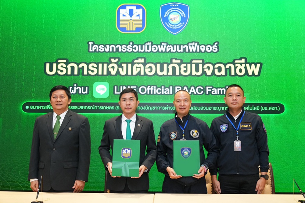 ธ.ก.ส. จับมือ บช.สอท. เดินหน้าเสริมแกร่งความปลอดภัยทางไซเบอร์ให้กับประชาชนทั่วประเทศ เปิดตัวฟีเจอร์ใหม่ “บริการแจ้งเตือนภัยมิจฉาชีพ” บน LINE Official BAAC Family โดยสามารถเช็ก – แจ้ง – เตือนภัยมิจฉาชีพได้สะดวกทุกที่ ทุกเวลา ผ่าน LINE Official BAAC Family โดยไม่มีค่าใช้จ่าย พร้อมเดินหน้าขับเคลื่อนการสร้างภูมิคุ้มกันด้วยการสนับสนุนความรู้ภัยไซเบอร์ให้กับประชาชนในวงกว้าง