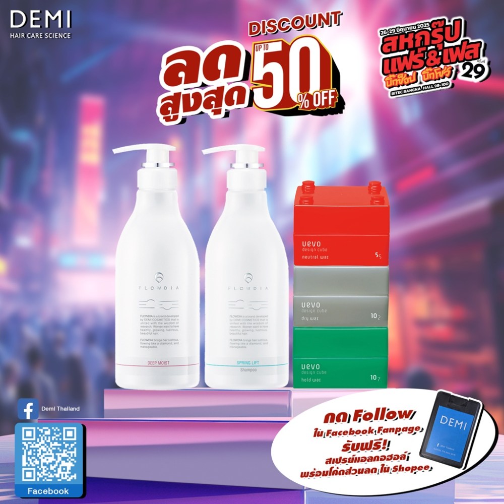 DEMI HAIR CARE SCIENCE ในเครือโอซีซี กรุ๊ป เอาใจคนรักเส้นผม มอบโปรโมชั่นลดสูงสุด 50% เมื่อซื้อผลิตภัณฑ์ของ DEMI HAIR CARE SCIENCE อาทิ Demi Uevo Design Cube Hair Wax 30g แว็กซ์ตกแต่งทรงผมชาย คุณภาพพรีเมี่ยม ลดเหลือราคา 250 บาท จากปกติ 390 บาท และ ผลิตภัณฑ์ DEMI FLOWDIA ที่มีทั้งแชมพูและทรีตเมนท์ เพื่อการดูแลผมอย่างล้ำลึก ลดเหลือราคา 775 บาท จากปกติ 1,550 บาท