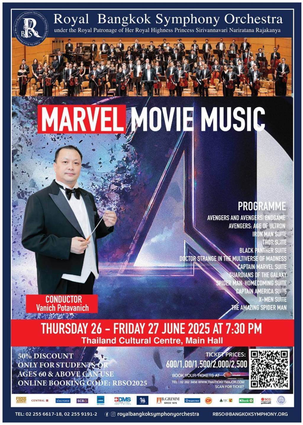 มูลนิธิรอยัลแบงค์คอกซิมโฟนีออร์เคสตร้า ในพระอุปถัมภ์สมเด็จพระเจ้าลูกเธอ เจ้าฟ้าสิริวัณณวรีนารีรัตนราชกัญญา จัดการแสดงคอนเสิร์ต Music from Marvel Studio ในวันพฤหัสบดีที่ 26 และวันศุกร์ที่ 27 มิถุนายน 2568 เวลา 19.30 น. ณ หอประชุมใหญ่ ศูนย์วัฒนธรรมแห่งประเทศไทย