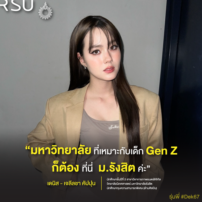 “เดนิสเลือกเรียนที่ ม.รังสิต เพราะหลายเหตุผลค่ะ อันดับแรกรุ่นพี่นักแสดงรีวิวเอาไว้ว่าที่นี่เหมาะกับอาชีพ และงานที่เดนิสทำ มหาวิทยาลัยสนับสนุน ยืดหยุ่น และเปิดกว้างมากๆ ค่ะ ไม่ใช่ว่าจะจบง่ายๆ เพราะเป็นศิลปิน นักแสดงนะคะ ยังต้องเข้าเรียนและทำงานส่ง ยิ่งสาขาภาพยนตร์งานไม่น้อยเลยค่า แต่เราก็มีเพื่อน มีอาจารย์ที่ช่วยเหลือ ให้คำแนะนำเป็นอย่างดีมาตลอดระยะเวลาที่เรียนค่ะ บอกได้เลยว่าคิดไม่ผิดที่เลือกเรียนที่ ม.รังสิต อีกสิ่งสำคัญเดนิสว่าเรื่องสังคม สภาพแวดล้อม ตอบโจทย์มากๆ ค่ะ Gen Z แบบพวกเราให้ความสำคัญกับหลากหลายเรื่อง ทั้งเรื่องตัวตนไลฟ์สไตล์ ความเท่าเทียม สิทธิมนุษยชน พูดได้เลยว่ามาเรียนที่นี่แล้วจะได้รู้เลยว่าที่นี่ตอบโจทย์มากๆ เป็นพื้นที่ให้พวกเราวัย Gen Z ได้เติบโตไปอย่างมีคุณภาพแน่นอนค่ะ”