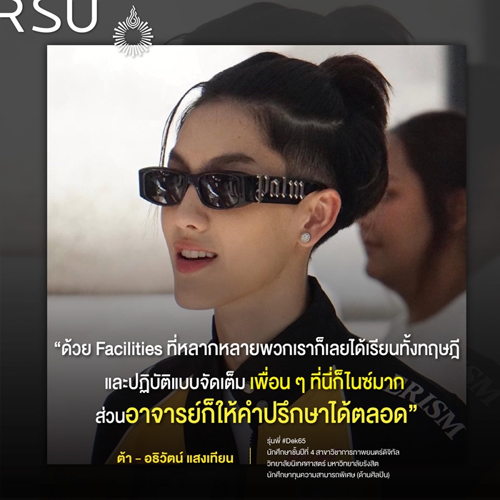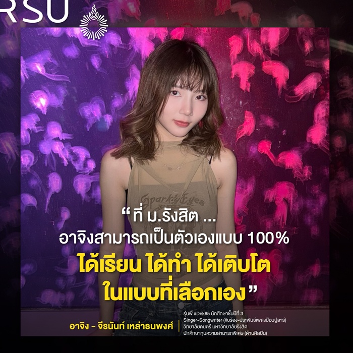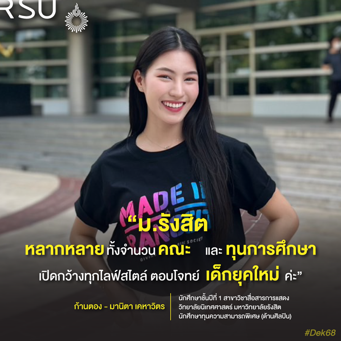 “ทำไมตอนนั้นถึงเลือก ม.รังสิต? เพราะที่นี่คือมหาวิทยาลัยที่ ‘รับฟัง’ จริงๆ เข้าใจว่านักศึกษา แต่ละคนมีความถนัด ความชอบ และความต้องการที่ต่างกัน ม.รังสิต ไม่พยายามให้ทุกคนเหมือนกัน แต่สนับสนุนให้เราเป็นตัวเองในแบบที่ดีที่สุด ผ่านมา 3 ปี ที่นี่อบอุ่นเหมือนบ้าน มีทั้งความรู้ กำลังใจ และการซัพพอร์ตที่หาได้ยากจากที่อื่น ถ้าใครกำลังมองหามหาวิทยาลัยที่ให้มากกว่าแค่การเรียน… อยากให้ลองมา ที่ ม.รังสิต ค่ะ”