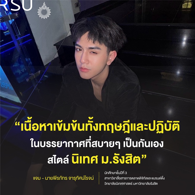 “เลือกเรียนที่มหาวิทยาลัยรังสิต เพราะมีสาขาที่สนใจครับ แจมเรียนด้านสื่อสารการตลาดดิจิทัลและแบรนด์ดิ้ง เป็นสาขาที่เรียนแล้วน่าจะเหมาะกับกระแสการประกอบอาชีพในปัจจุบันครับ บรรยากาศการเรียนก็อบอุ่น เป็นกันเอง อาจารย์ รุ่นพี่ และเพื่อนๆ ส่วนเนื้อหาการเรียนก็เข้มข้นทั้งทฤษฎีและปฏิบัติ สนุกๆ ครับ”