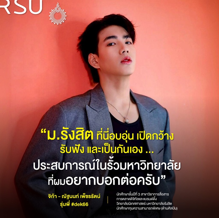 “จิก้า มองว่า ม.รังสิต มีคณะที่หลากหลาย ตัวหลักสูตรก็น่าสนใจ มีความชัดเจน ยิ่งแต่ละรายวิชา ก็ทันสมัย ตรงกับไลฟ์สไตล์เด็กรุ่นใหม่ครับ เป็นมหาวิทยาลัยที่เชื่อเลยว่า ถ้าใครได้ลองมาเรียน มาใช้ชีวิตนักศึกษา จะตอบว่าที่นี่ “ใช่” ที่นี่ “ตอบโจทย์” ครับ และที่นี่ ให้เราได้มากกว่าความรู้ในห้องเรียน เพราะมีประสบการณ์ในรั้วมหาวิทยาลัยให้นักศึกษาได้ลองทำอีกมากมาย ไม่ว่าจะเป็นกิจกรรมภายใน กิจกรรมนอกมหาวิทยาลัย ที่สำคัญอุปกรณ์การเรียน ห้องเรียน สิ่งอำนวยความสะดวกมีมากพอที่จะรองรับนักศึกษาครับ ไลฟ์สไตล์ของนักศึกษา สังคมที่นี่ก็ไม่ซับซ้อน เข้าถึงง่าย อาจารย์เป็นกันเอง เพื่อนๆ ก็สนุกสนานครับ ผมคิดว่าผมได้พัฒนาตัวเอง โตขึ้น และได้รู้จักตัวเองมากขึ้น จากการได้เรียน ได้ใช้ชีวิตอยู่ที่ ม.รังสิตครับ อยากชวนน้องๆ มาร่วมค้นหาตัวตน และมาเติบโตในรั้วมหาวิทยาลัยรังสิตด้วยกันนะครับ”