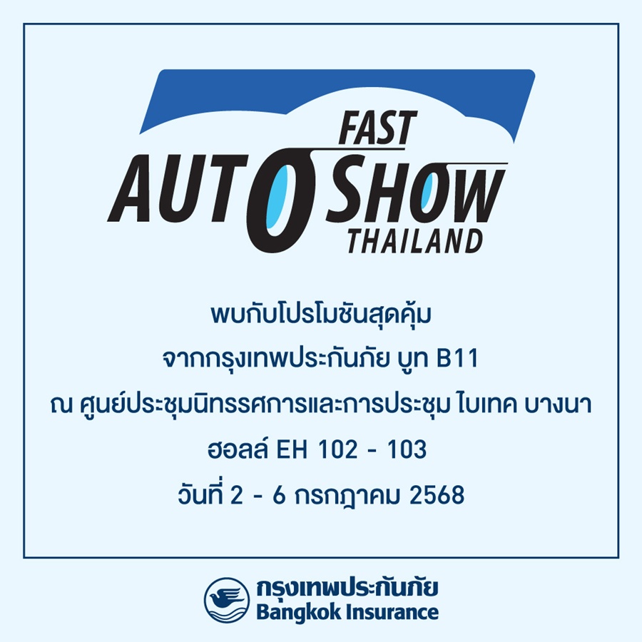 บริษัท กรุงเทพประกันภัย จำกัด (มหาชน) ร่วมออกบูทในงานมหกรรมจำหน่ายรถยนต์ครบวงจร FAST Auto Show Thailand 2025 ระหว่างวันที่ 2 – 6 กรกฎาคม 2568 ณ ศูนย์นิทรรศการและการประชุมไบเทค บางนา ฮอลล์ EH 102 – 103